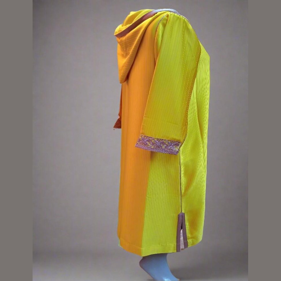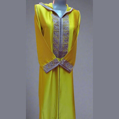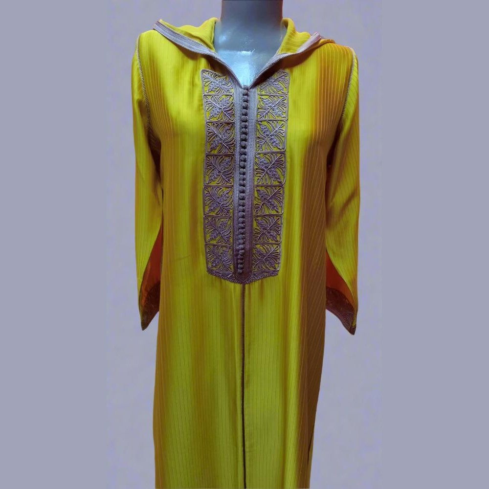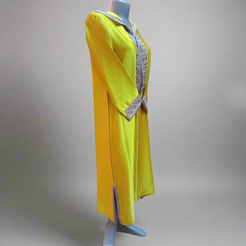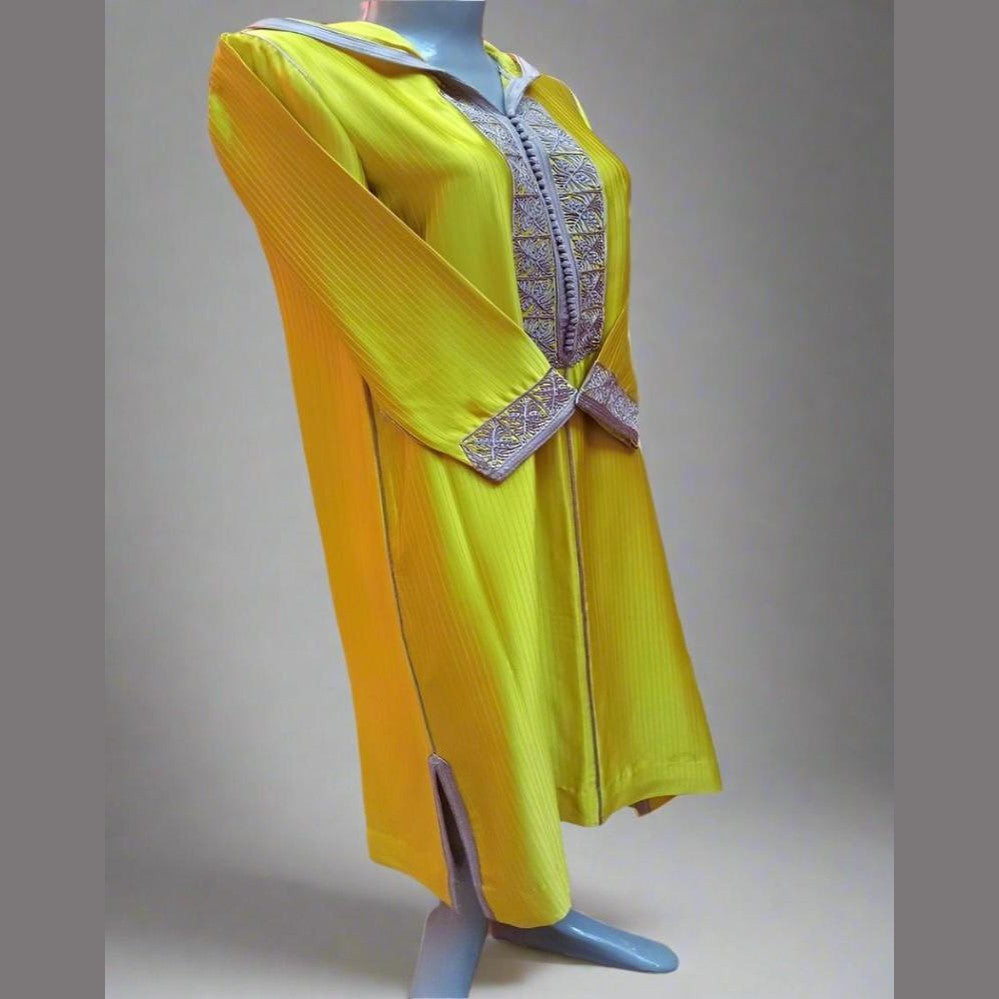 Esta exclusiva chilaba marroquí está confeccionada con el mejor satén mostaza y lleva hilo gris marroquí (sfifa) en la parte delantera del caftán y las mangas. Además, lleva más de 40 aakad (pompones) y bordados con motivos florales.
