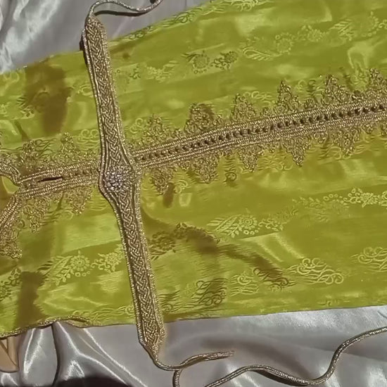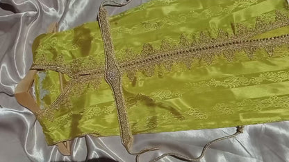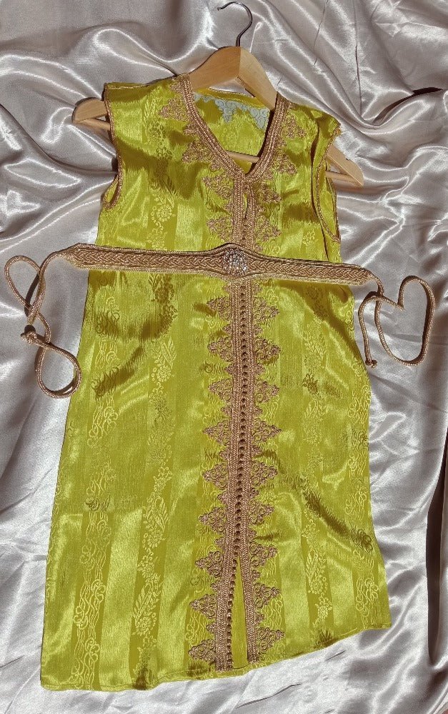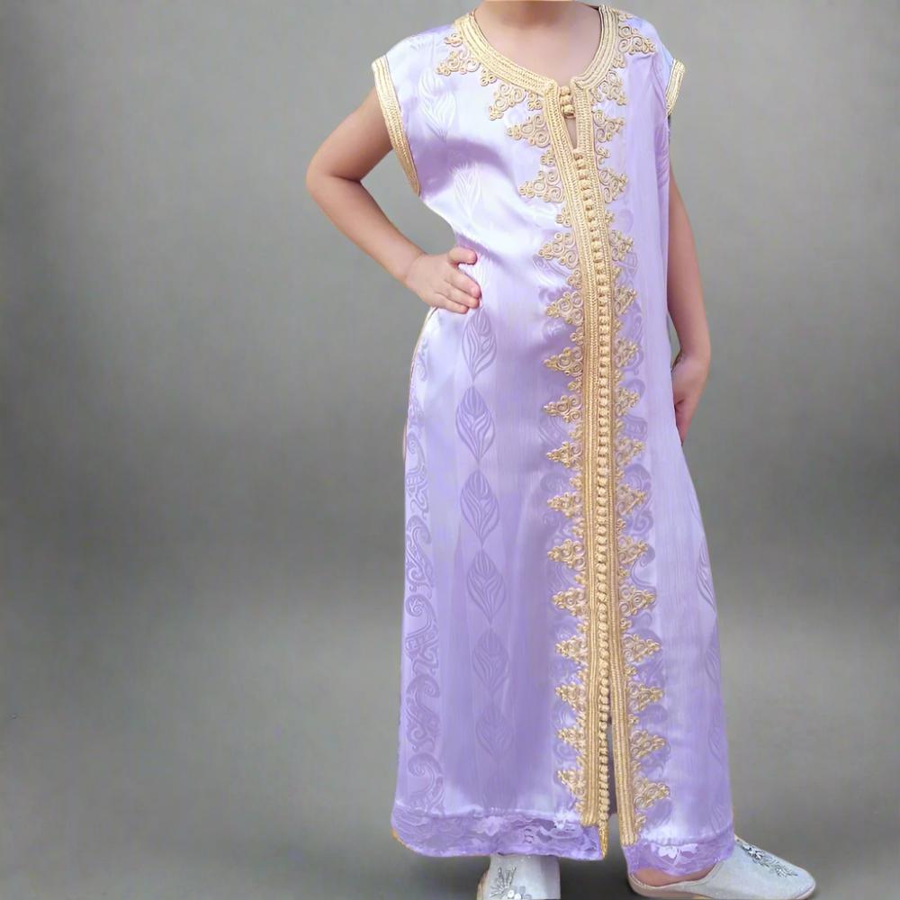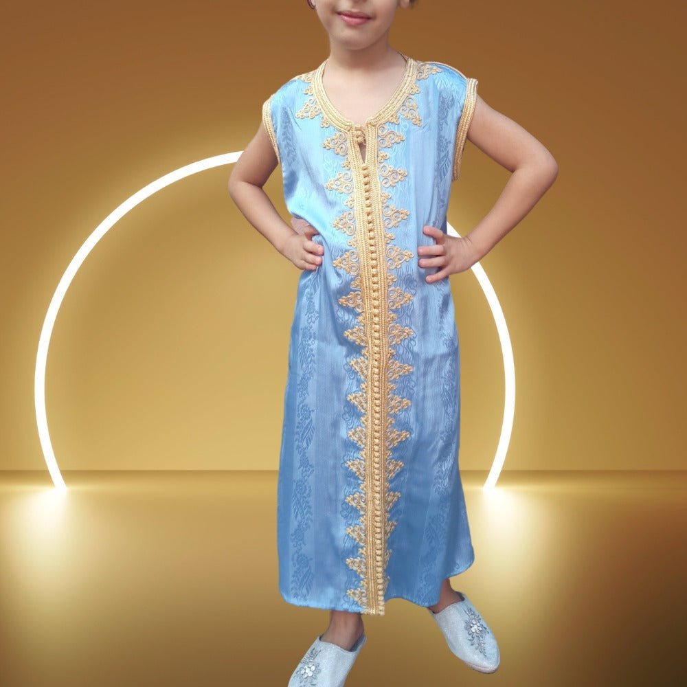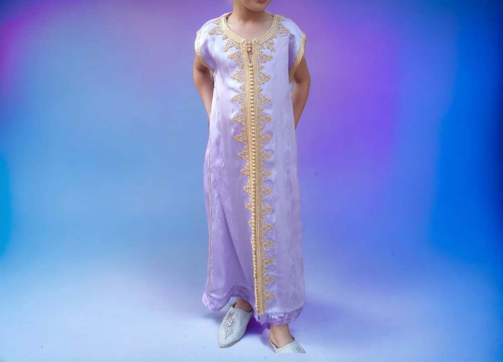 Compre hoy nuestro caftán de seda marroquí para niños con bordado dorado y deje que su pequeño brille como una estrella en cada ocasión especial.