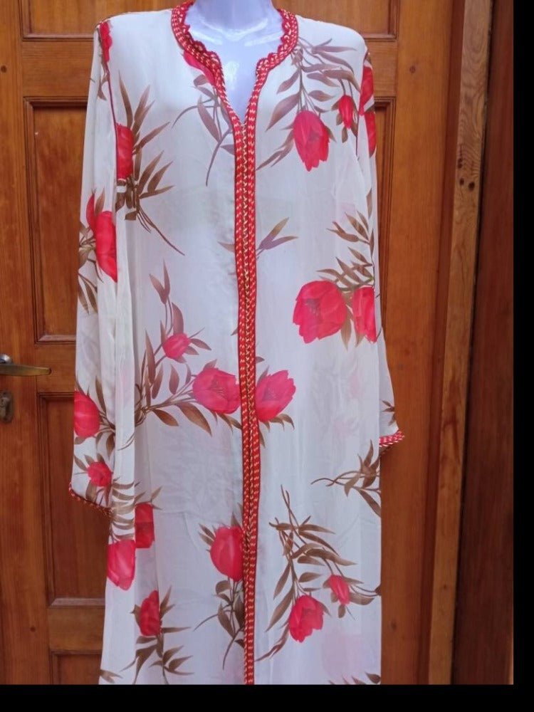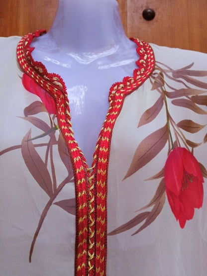 Colores: El color principal es Beige/Marfil y rojo y bordado dorado hecho a mano "Sfifa" en las mangas y alrededor del cuello hasta el final del vestido como se muestra en la imagen.