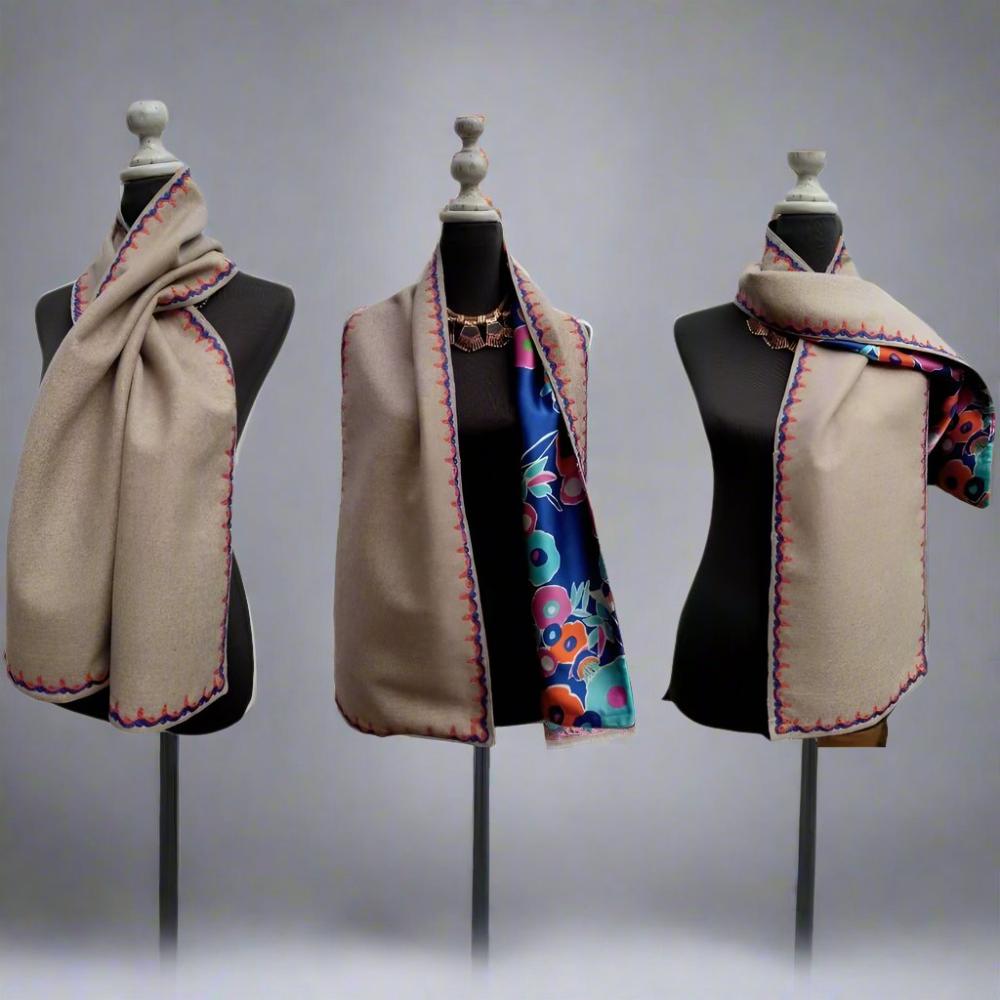 Fabricada con la mejor cachemira beige y con un forro de satén multicolor, esta bufanda rezuma lujo, estilo y tendencia.