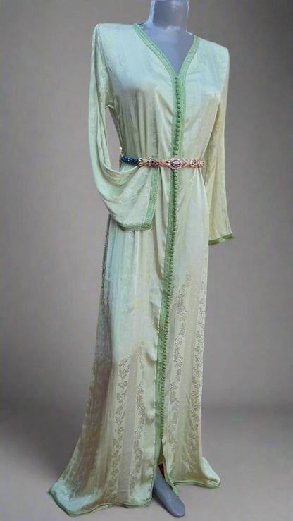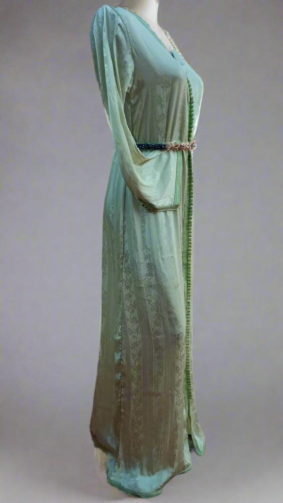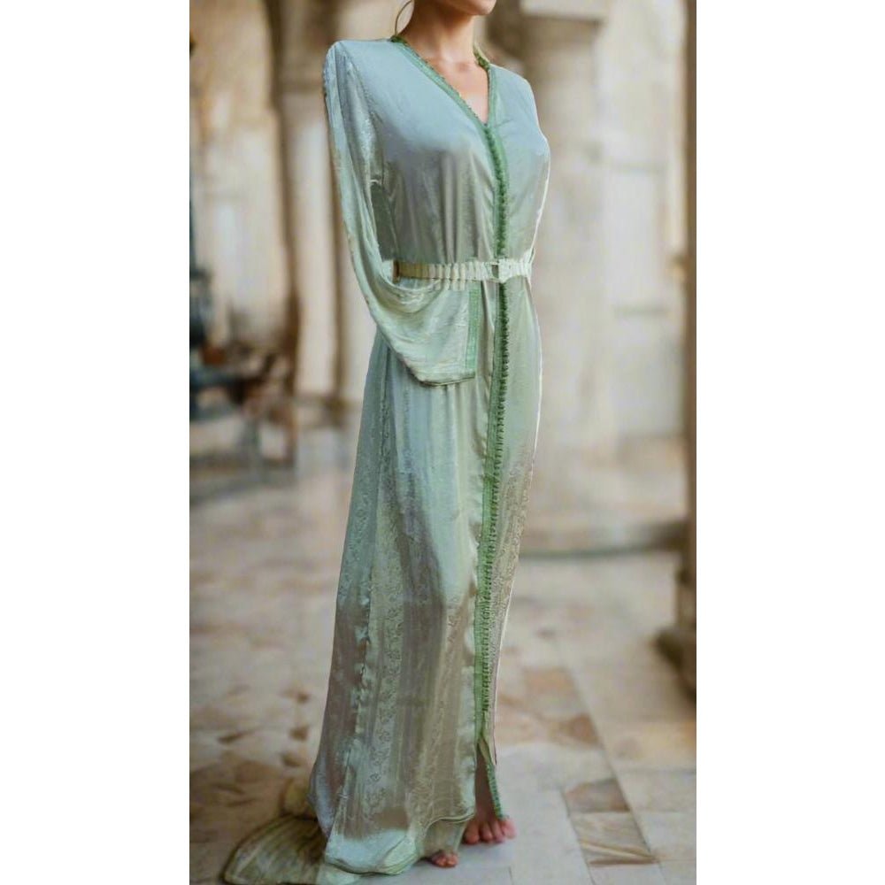 Hermoso caftán largo marroquí bordado con materiales de alta calidad (seda Jawhara verde menta) elaborado a mano y diseñado por un miembro del taller Heritage Handmade.