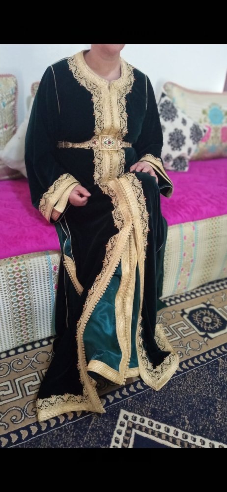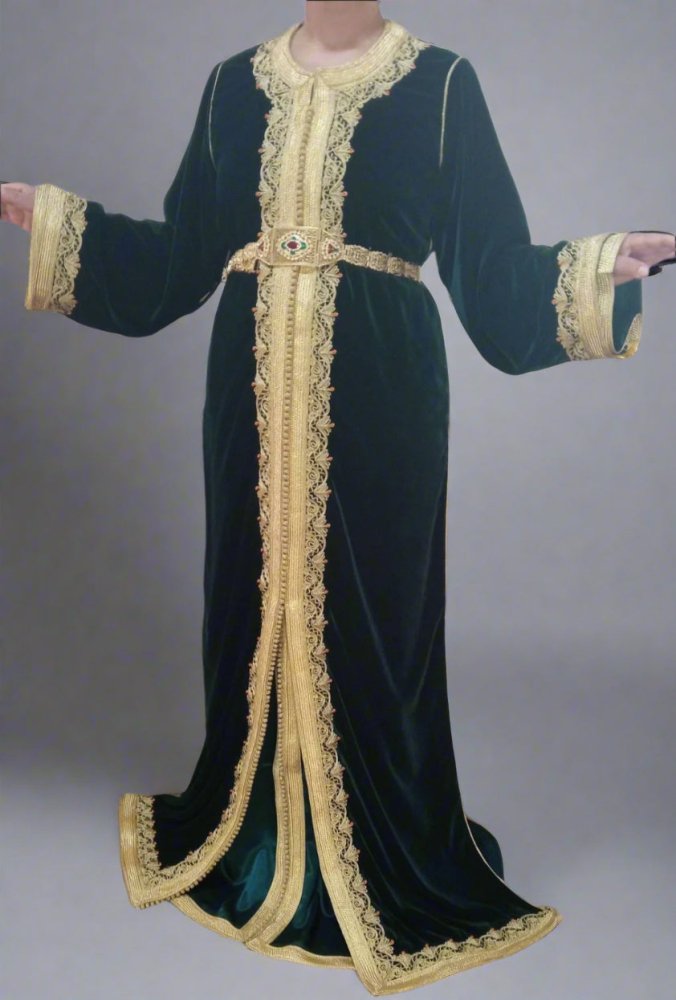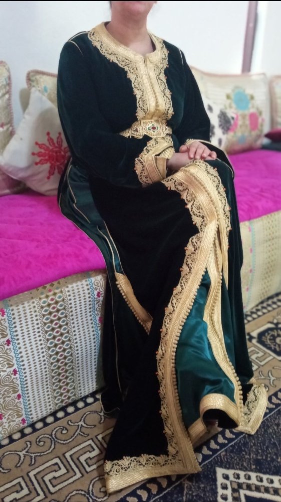 *Un caftán de seda verde oscuro con el hilo dorado Sfifa en el medio, en ambos lados, en las mangas y en el final del caftán.