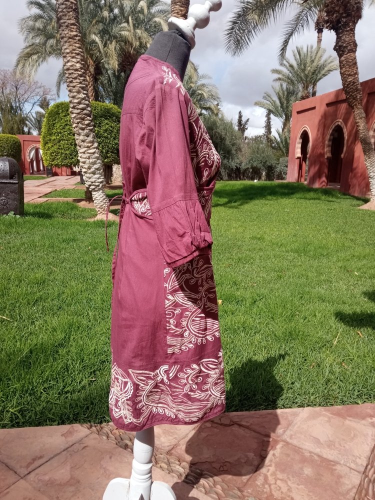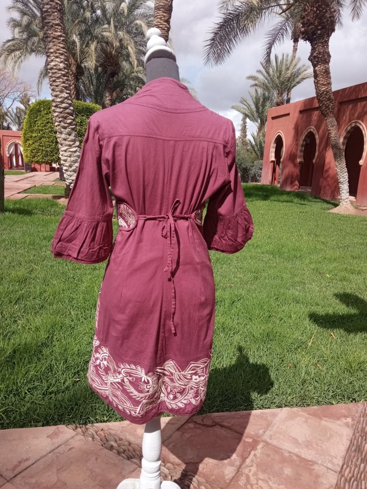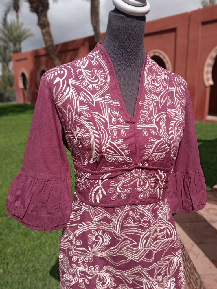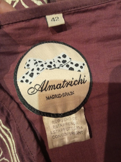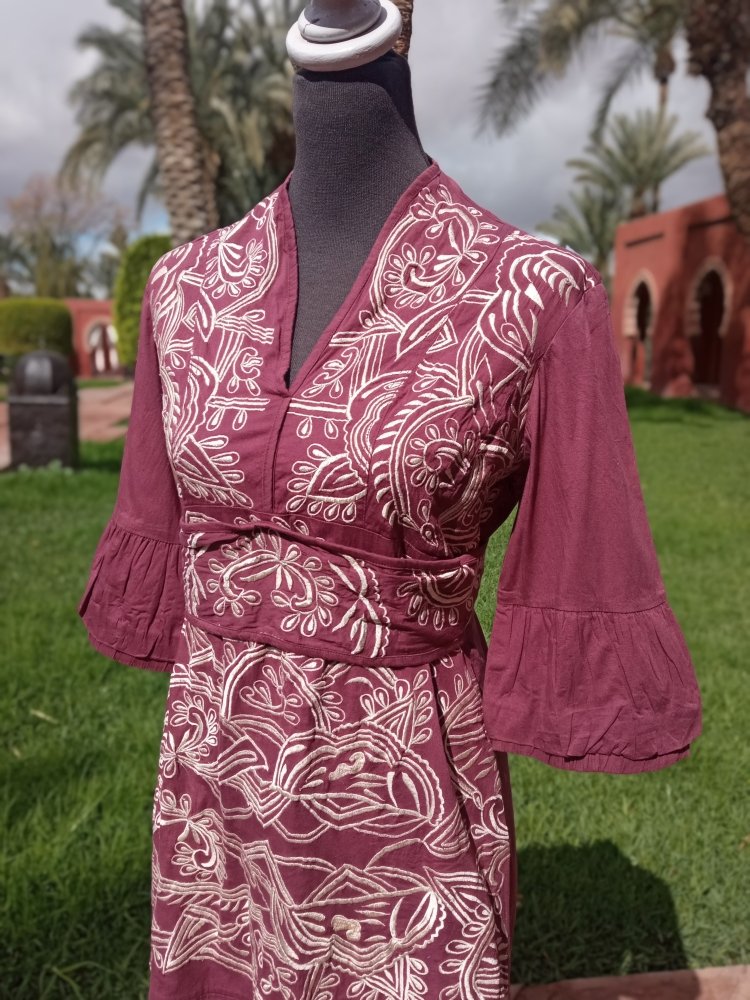 This beautiful dress from Almatrichi Madrid is in Kalamata color. It is embellished with light gold rich floral embroidery, has 3/4 sleeves, and a V-neck collar. A wide embroidered belt is tied in front.