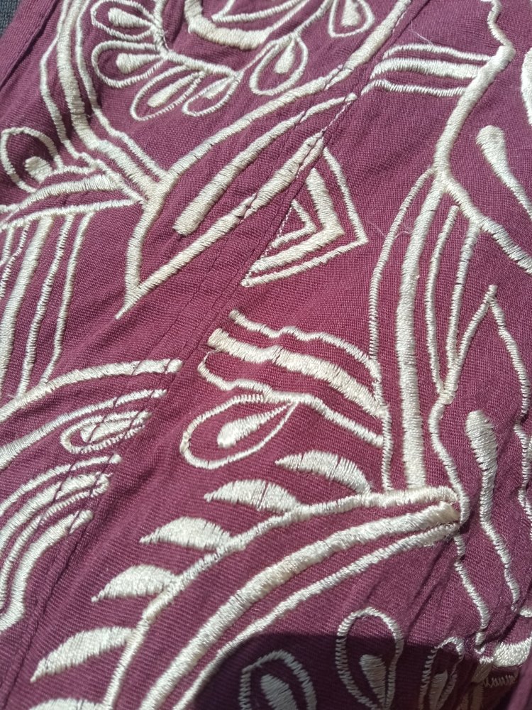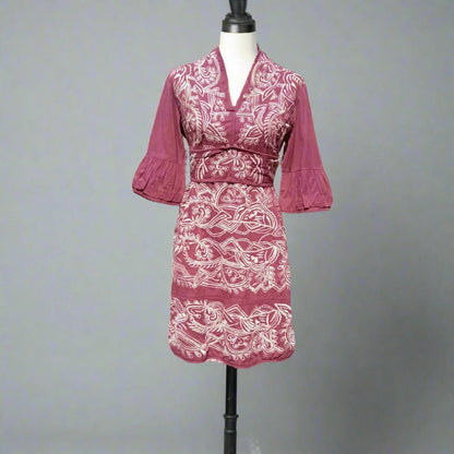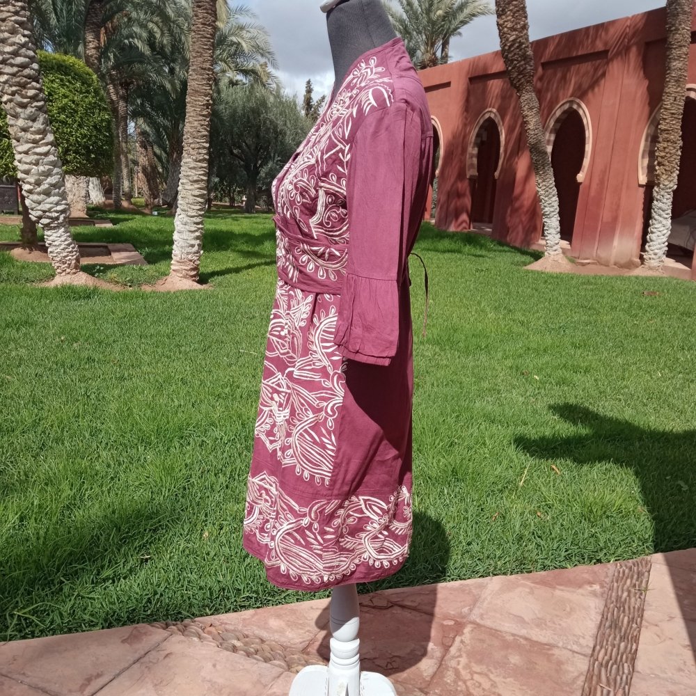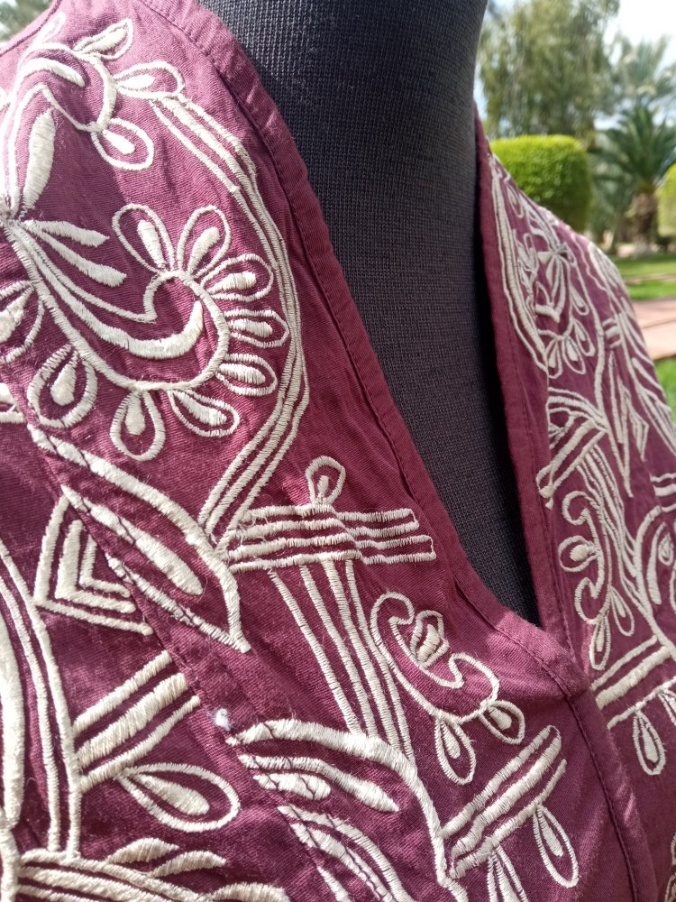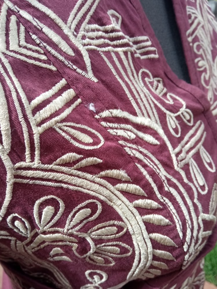 This beautiful dress from Almatrichi Madrid is in Kalamata color. It is embellished with light gold rich floral embroidery, has 3/4 sleeves, and a V-neck collar. A wide embroidered belt is tied in front.