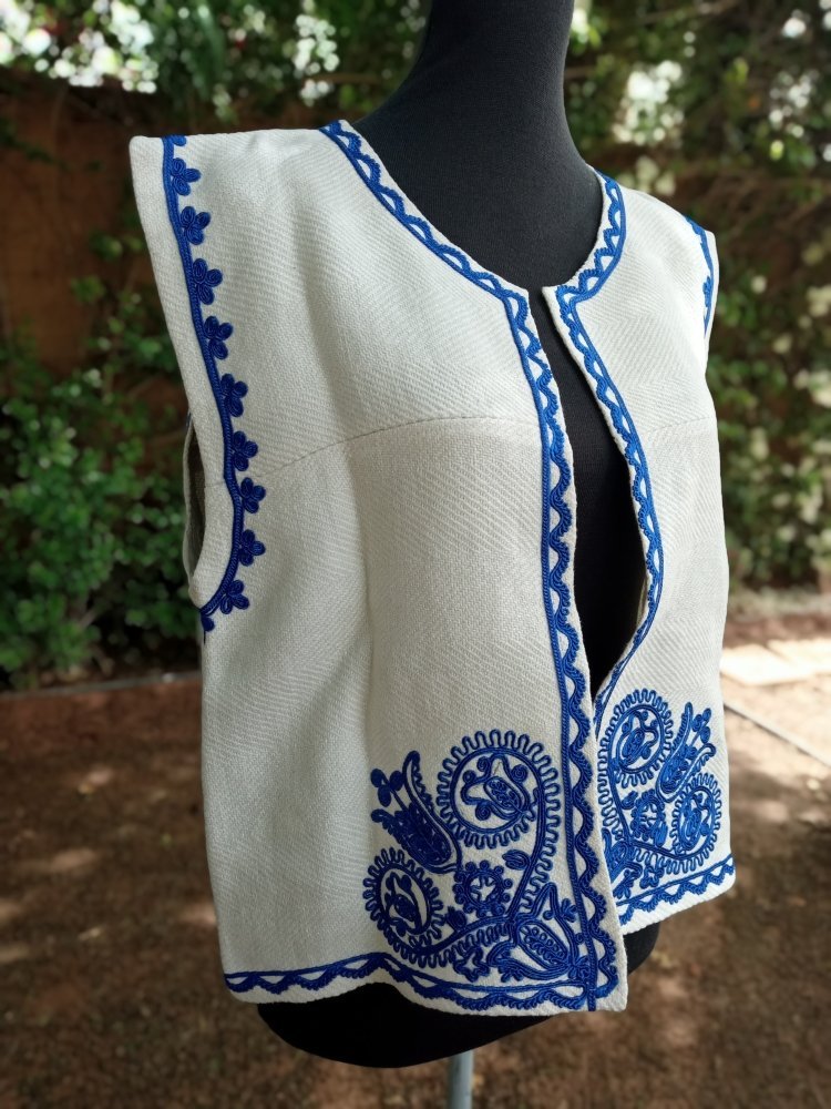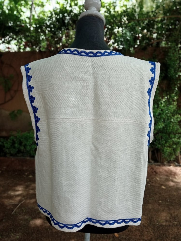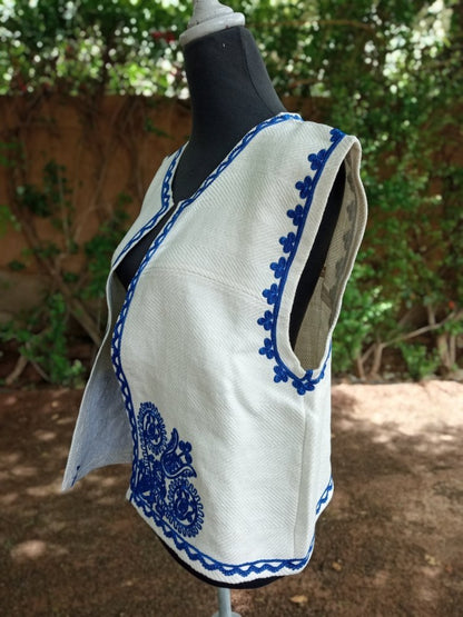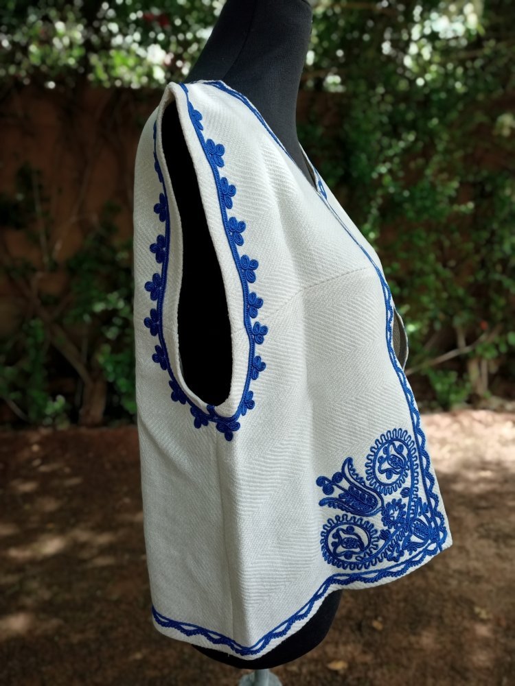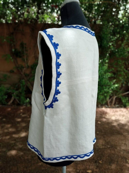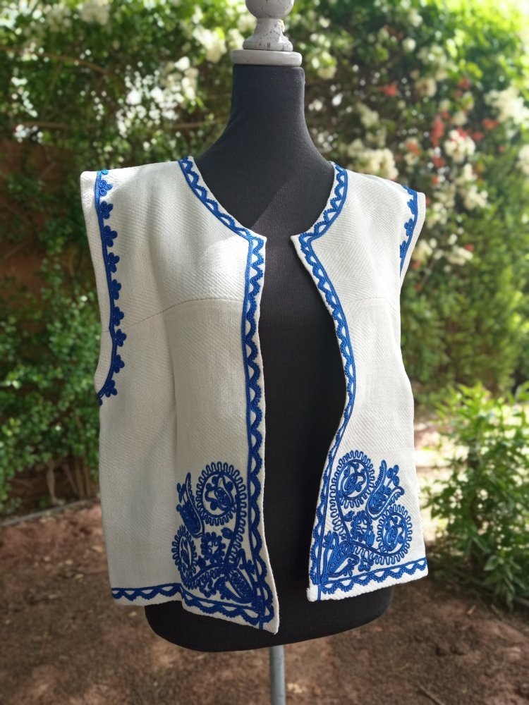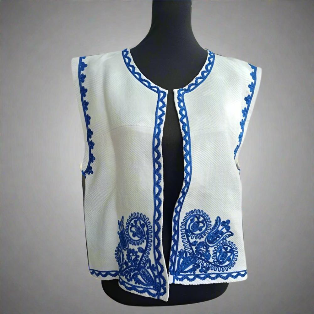 Confectionné de main de maître dans notre atelier, ce gilet en lin brodé bleu pour femme allie style élégant et chaleur.