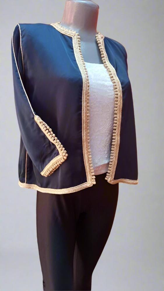 Fabriquée à partir de la soie la plus fine, avec une broderie marocaine dorée unique, cette veste sera sûrement unique dans votre garde-robe.