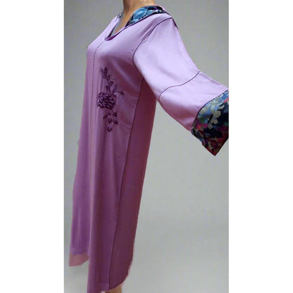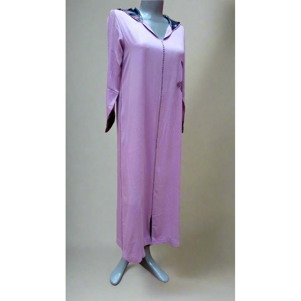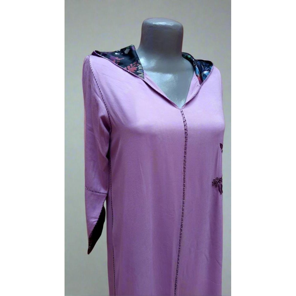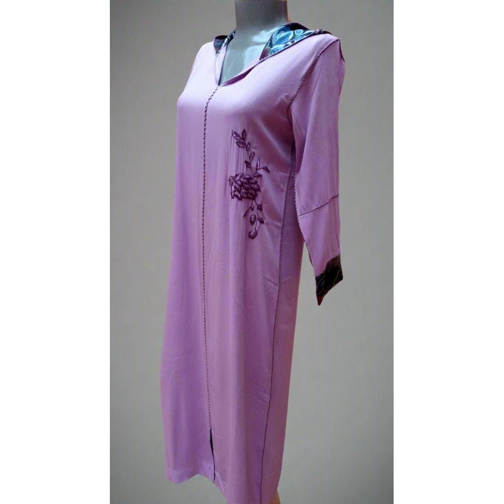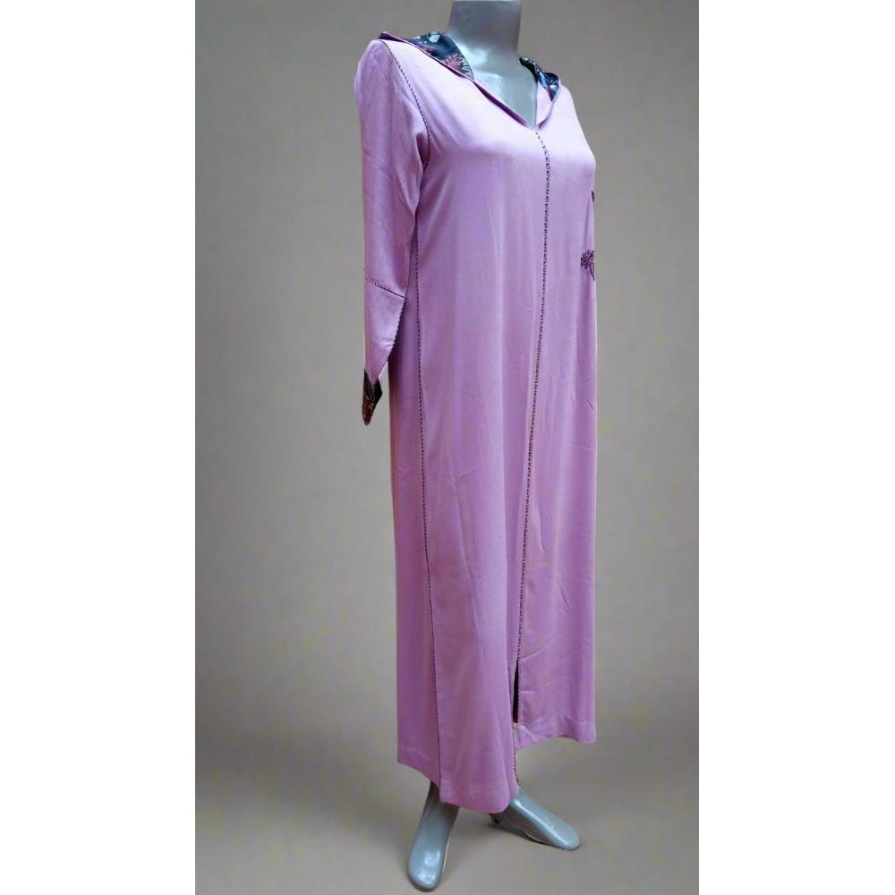 Une jolie Djellaba marocaine violet clair brodée avec des matériaux de haute qualité fabriquée à la main, conçue par un membre de notre "Heritage Handmade shop"