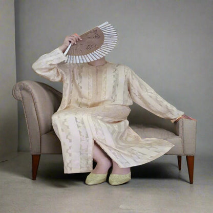 Un joli caftan marocain brodé avec des matières de haute qualité (soie Jawhara beige) confectionné à la main, conçu par un membre de notre boutique Heritage Handmade