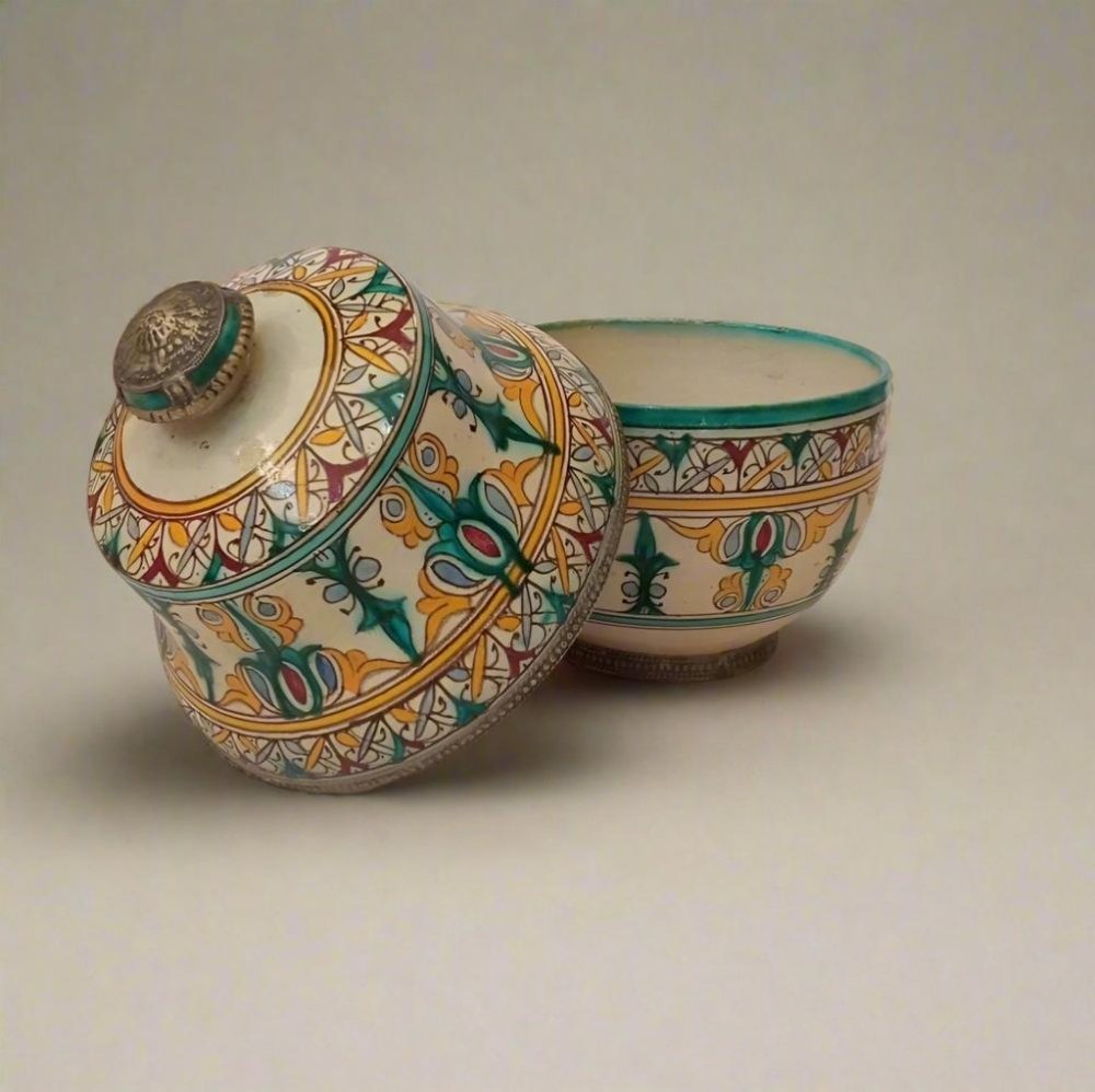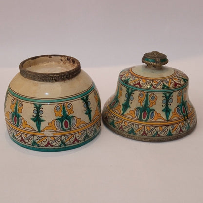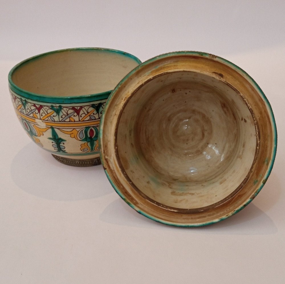 La céramique de Fez, Afrique du Nord, un bol africain coloré peint à la main avec un couvercle. Unique peint en turquoise et a été fabriqué avec une garniture en métal. Ce vase en céramique est peint à la main et conçu de manière décorative, peint en détail avec des décorations des années 70 et du 19e siècle, pour la décoration intérieure bohème ou les collectionneurs
