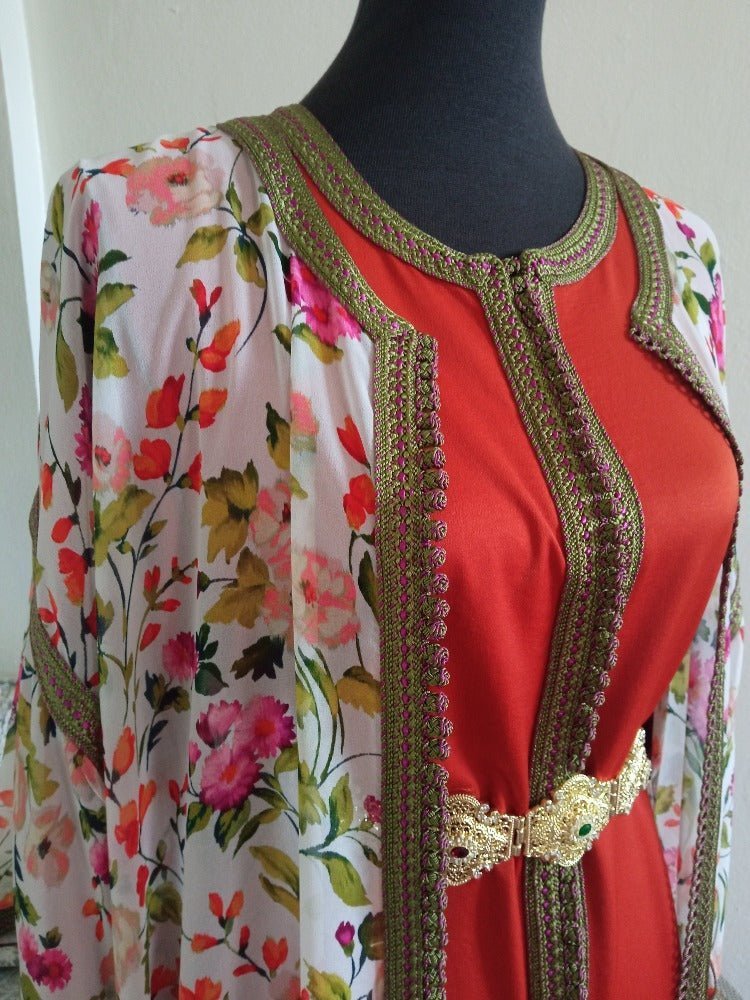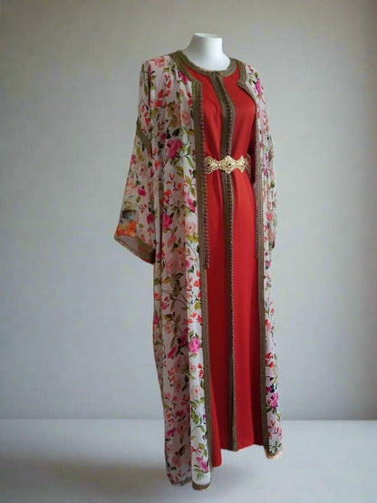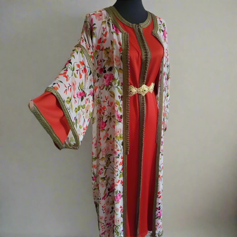 Entrez dans un monde d'élégance avec notre caftan moderne floral marocain fait main en 2 pièces, spécialement conçu pour les mariages.