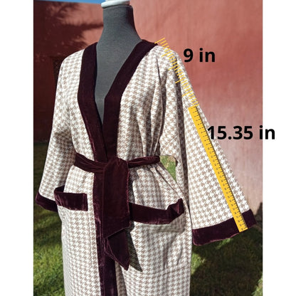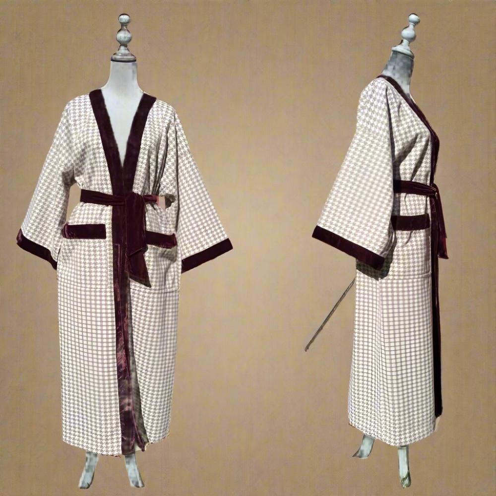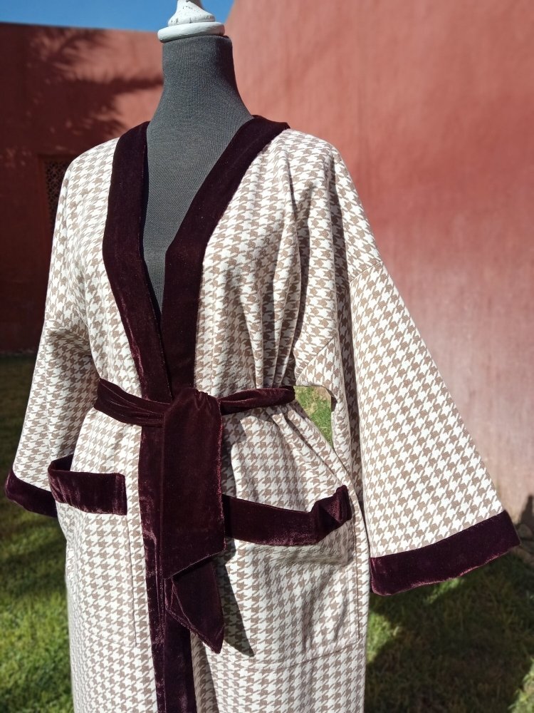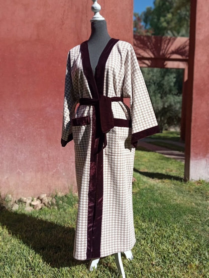 Fabriqué en cachemire marron clair et en velours bordeaux le plus fin avec 2 poches latérales larges, coupe ample, manches longues et une belle ceinture en velours bordeaux.