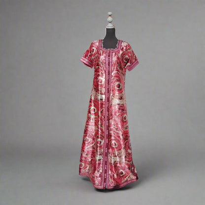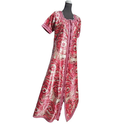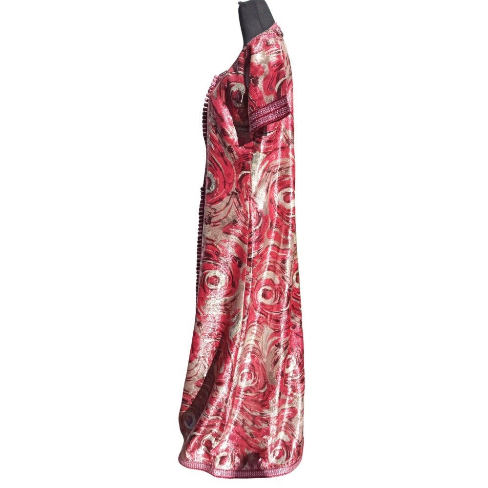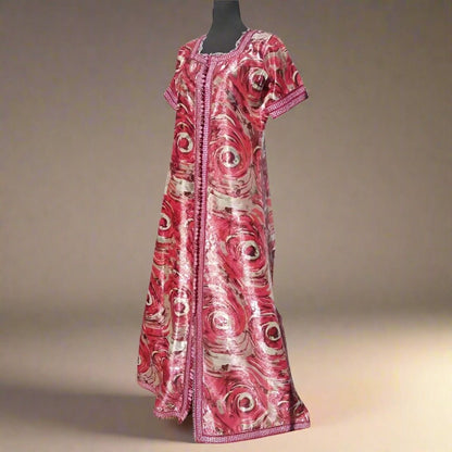 The luminous Floral and silver metallic caftan is made in a subtle metallic floral patterned brocade with shades of silver, princess short sleeves, fully front Red thread buttoning with 120 pink, Red, and silver hand-knotted looped buttons as roses🌹