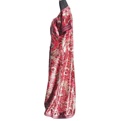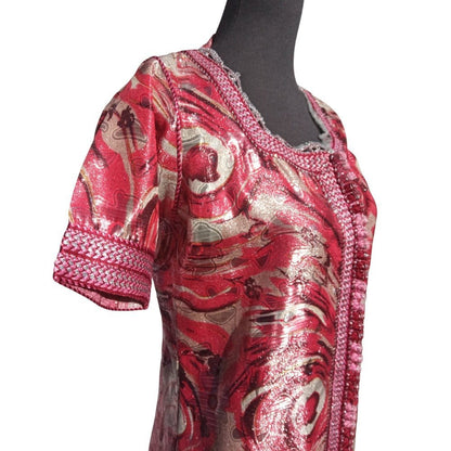 This chic Gypsy Bohemian Medium dress brocade kaftan, embroidered and embellished with large Red and Silver thread trim.