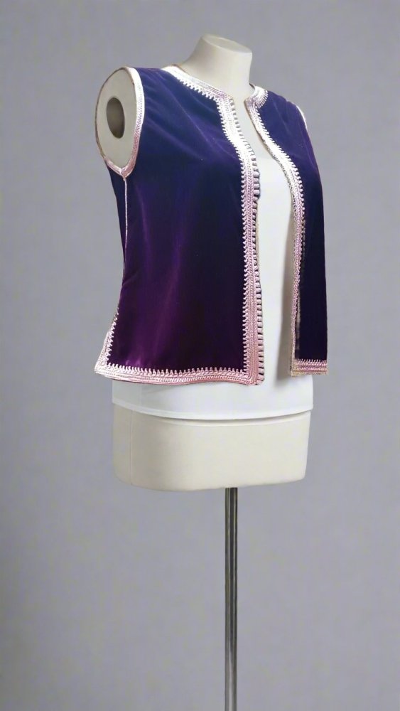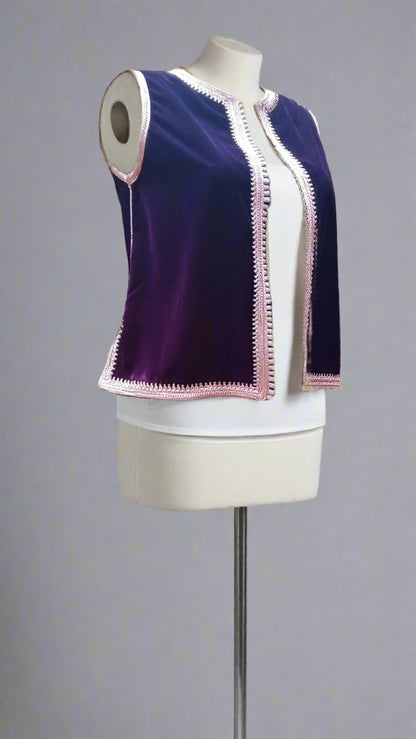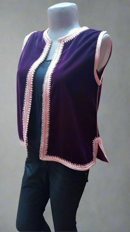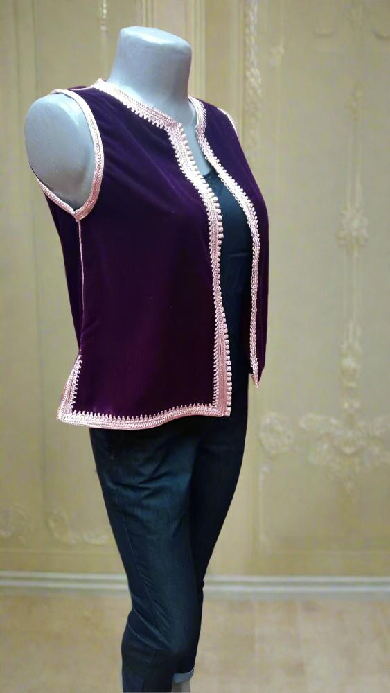 Made from the finest purple velvet, With a unique bronze Moroccan embroidery pattern, and a sleeveless jacket, this Jacket will surely be one-of-a-kind in your closet.