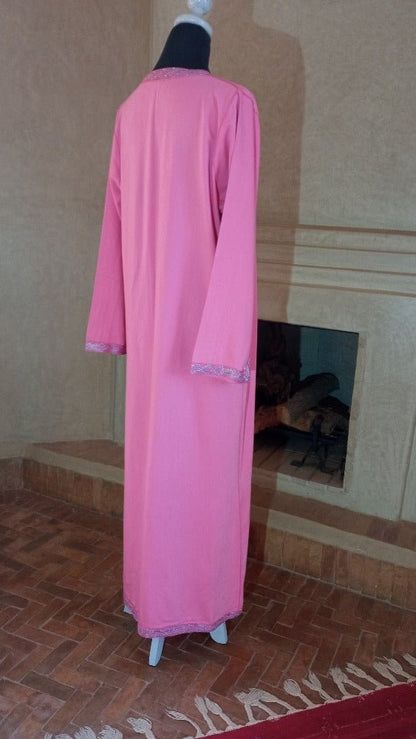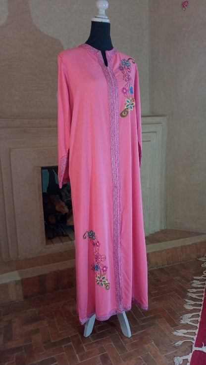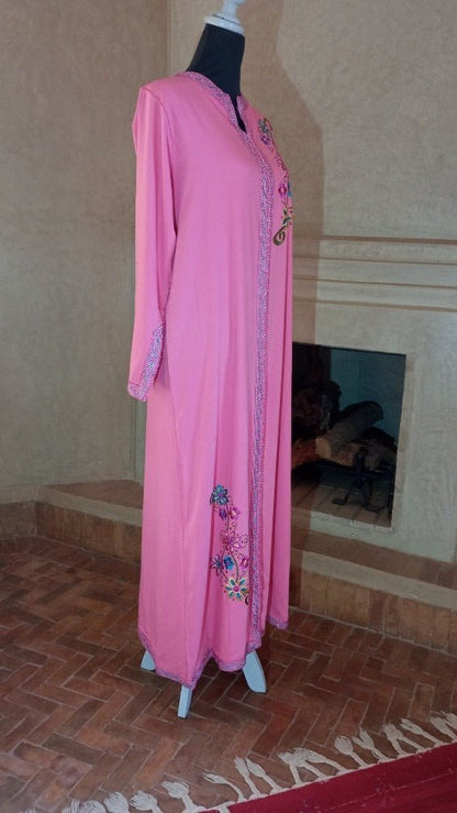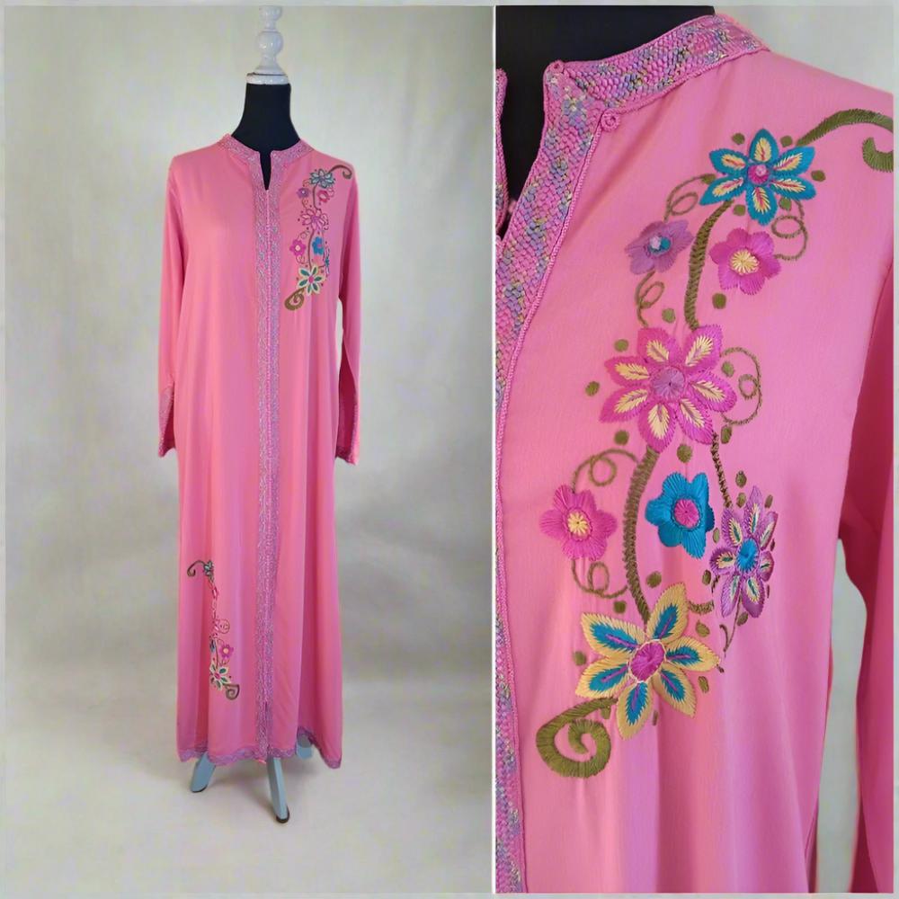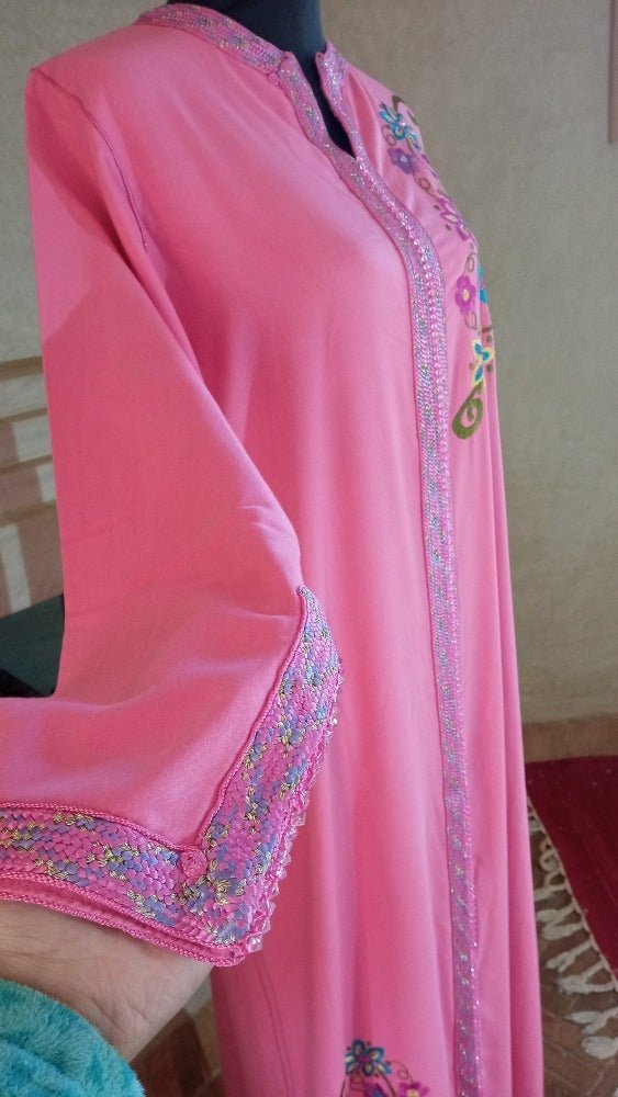 A truly magnificent pink floral caftan made in stunning Mlifa pink fabric is both sophisticated and glamorous. It has unusual bell sleeves, all finished with insanely detailed handmade colorful woven edging.