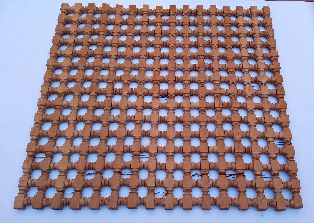 Mosharabi, also known as mashrabiya, mosharabia, or mousharabieh are hand-carved wooden lattice screens and are a traditional Moorish craft. Allowing for light and air, but preserving privacy, these wood panels are ideal for doors, windows, or other architectural elements. Or even as a mirror frame (like in the picture)