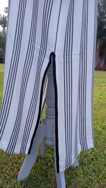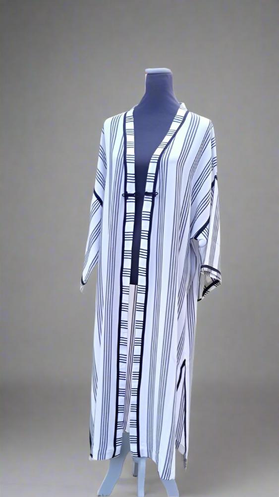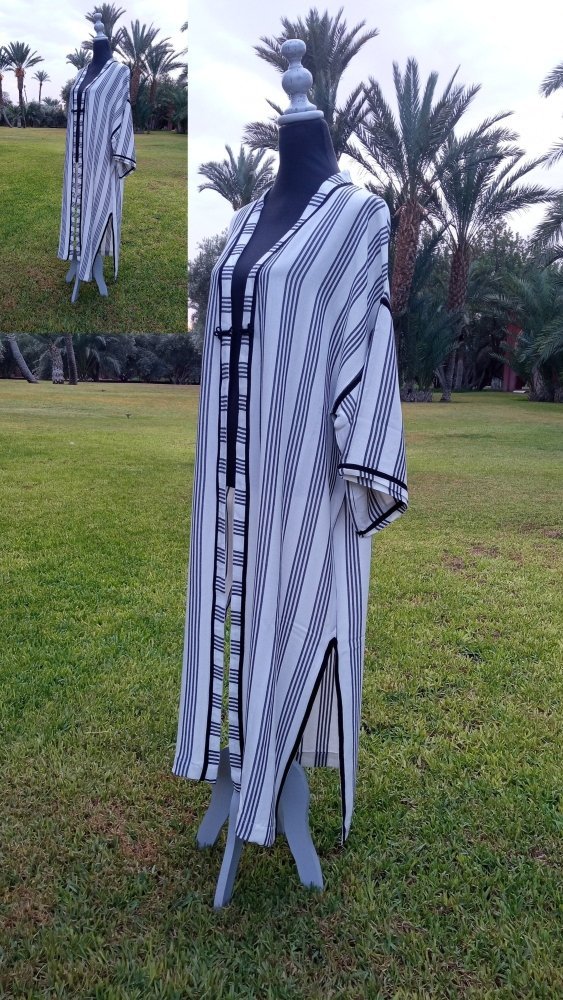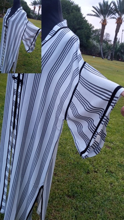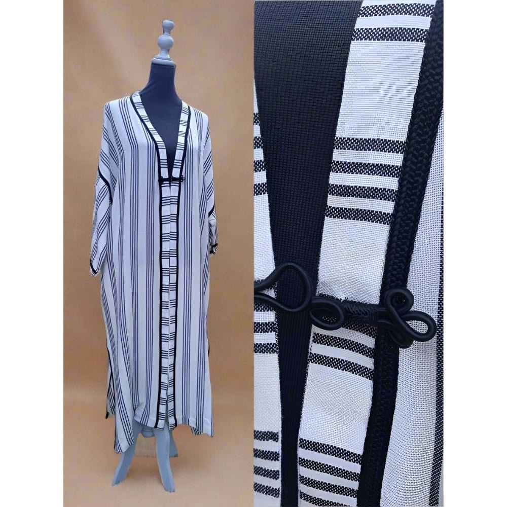 Amazing Handmade black and white stripe kimono kaftan made from organic cotton which is the best choice for this summer hot season, stripe Kimono with Embroidered Moroccan button and Moroccan trim in black in a unique design you'll not find anywhere else. Very gorgeous style Kaftan Kimono, for minimalist looks.