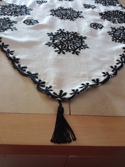 A unique table Runner design, black embroidery, Table Runner pom-pom, original Moroccan table Runner, Boho table runner, black wedding table runner, gift for her, Christmas gift, gift for him, black event centerpiece runner