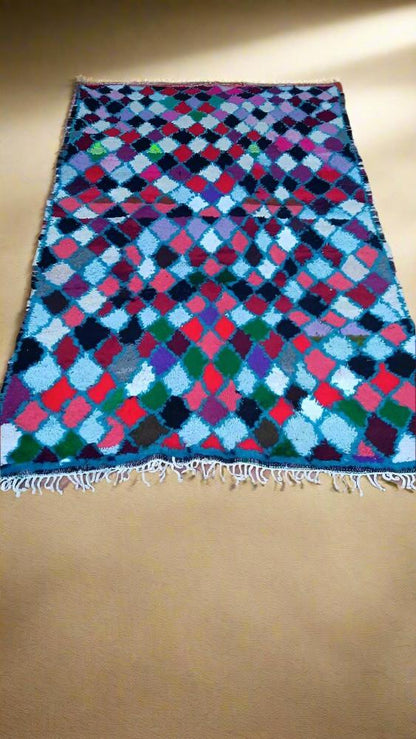 Beautiful Moroccan Atlantic Boucherouite Rug hand-crafted by woman at home in the High Atlas (Ait Ourir) region of Marrakech, Morocco. Every Moroccan rug is textured with variety of textiles all hand woven. A lovely luxurious soft pile is woven from the weaver's imagination colors style and motifs chosen as expressions of Moroccan tribal tradition.