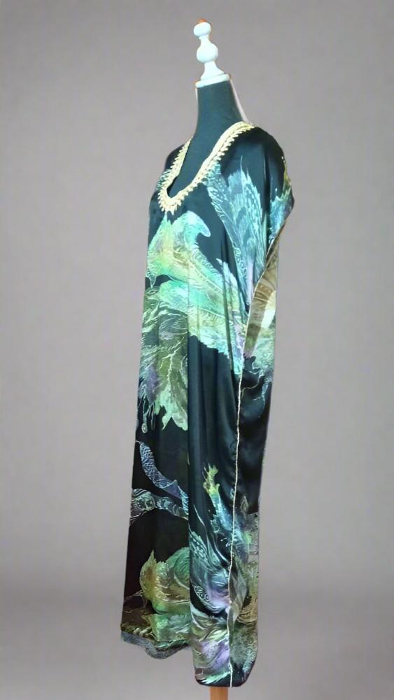COLOR: Black background, green, orange patterns, and gold embroidery