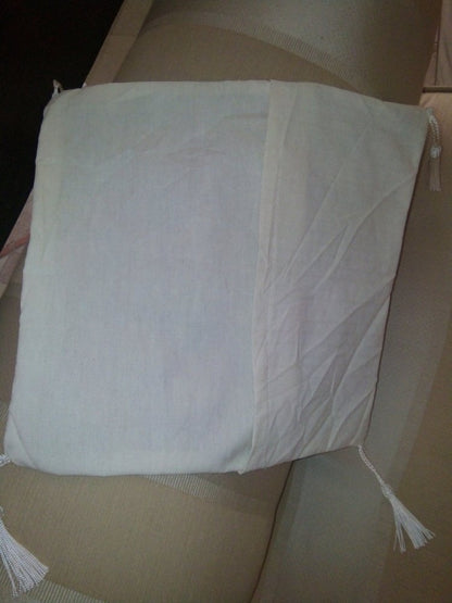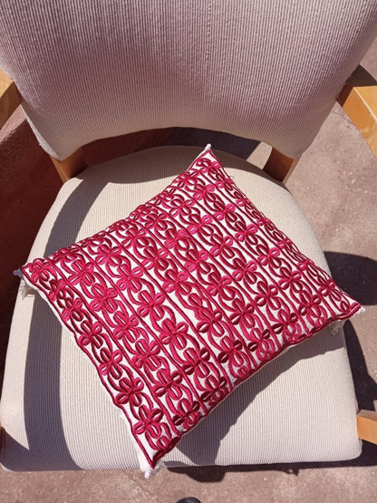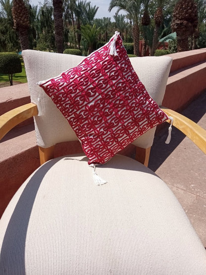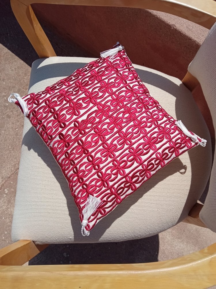 The design is a combination between the old work "Tarz Beldi or Rbati" and the Moroccan white handmade pom pom "aakad" and a beautiful white handmade "chocha" by "lmaalam" all around the cushion.