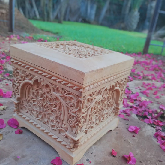 • This unstained, carved Moroccan large cedar box is a beautiful and unique storage solution that adds a touch of elegance to any room