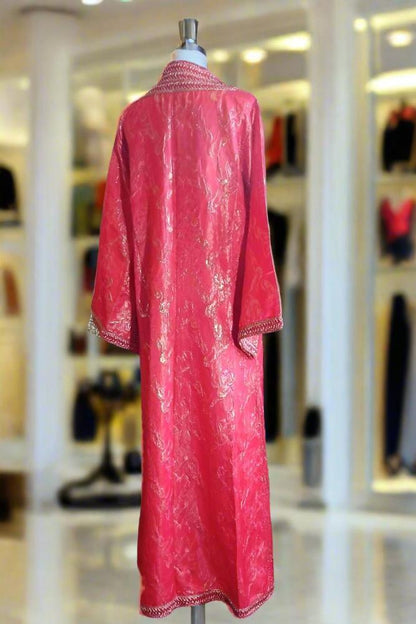 The luminous Red and gold metallic caftan is made in a subtle metallic floral patterned brocade with shades of gold, princess long wide sleeves, fully front gold thread buttoning with hundreds of gold and red hand-knotted looped buttons.