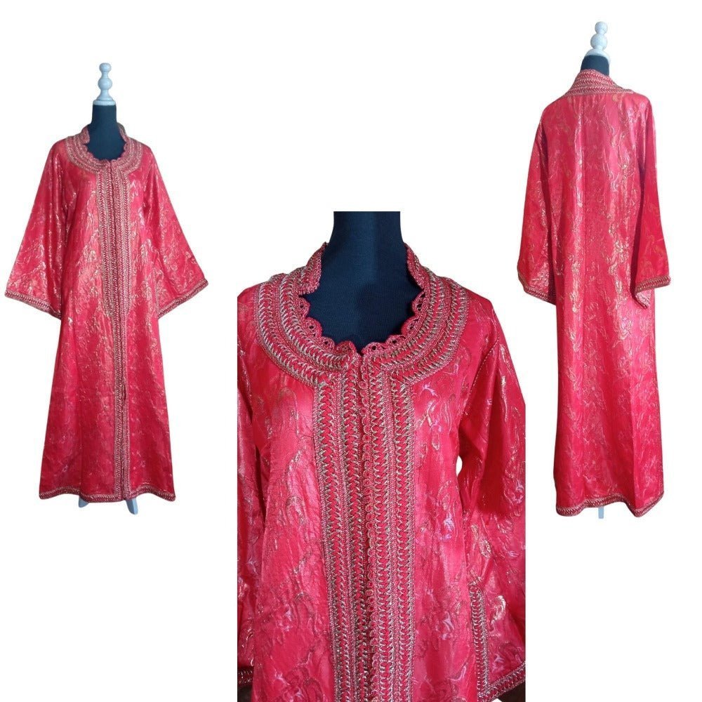 This chic Gypsy 70s Bohemian Maxi dress brocade kaftan is embroidered and embellished with gold and red large metallic trim. One-of-a-kind evening Moroccan Middle Eastern gown. Vintage exotic 1970s Red gold metallic floral brocade dress kaftan with gold trim handmade in North Africa, Morocco.